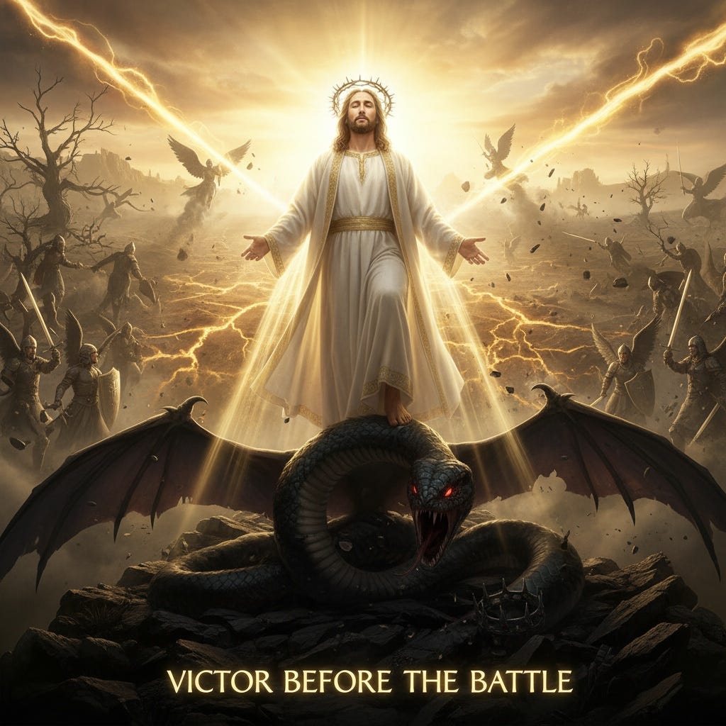 Radiant Christ stands victorious, divine light piercing darkness, serpent crushed beneath His feet. Wilderness landscape transforms into celestial battlefield, symbolizing ultimate spiritual triumph. Golden glory overwhelms shadowy defeat, revealing eternal victory before the final confrontation.